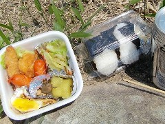 この弁当は妻がガキの弁当の残り物を詰めてくれた物です。いちばんうれしいパターンで果物まで入れてくれてます。勝手にビールを冷蔵庫から拝借して持って行きました。飯盛山の山頂でタダひとりめしあがりました。
